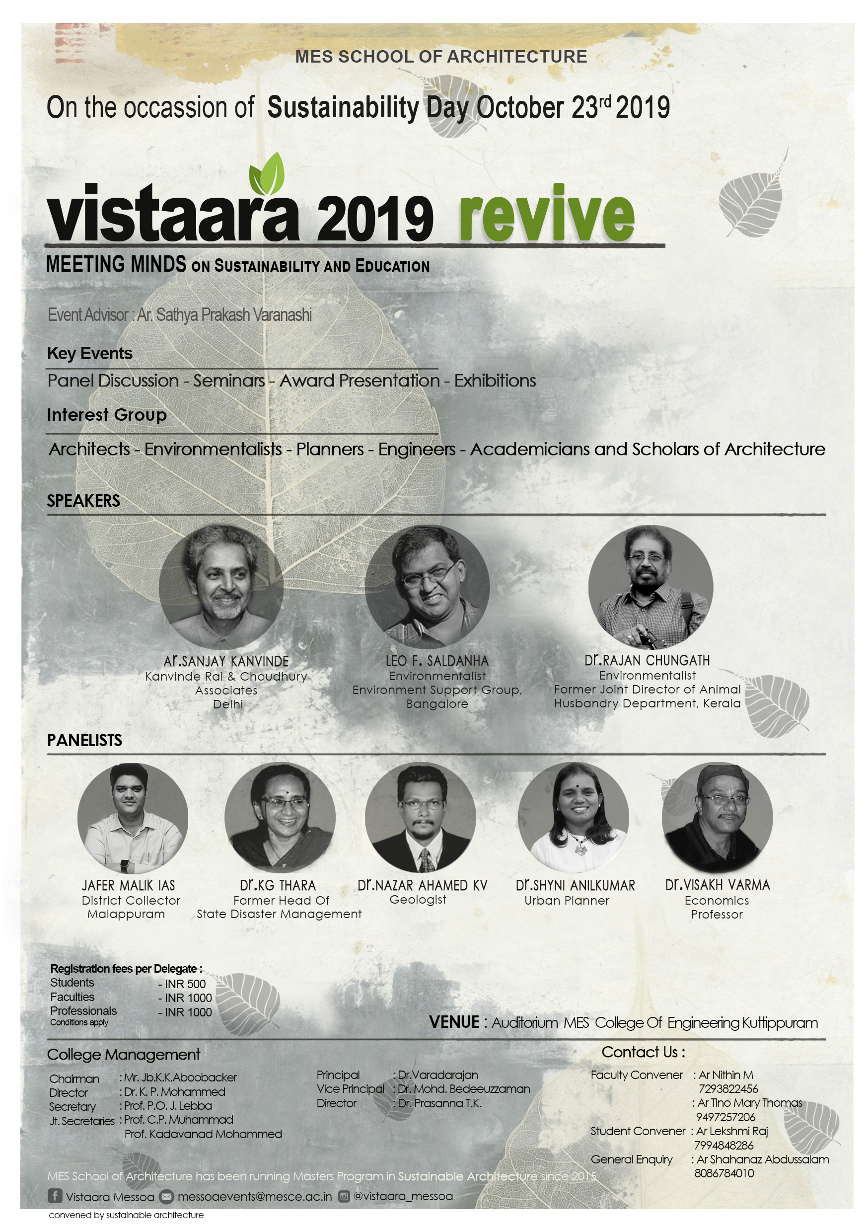 P. G. Program M Arch in Advanced Architecture was started in the year 2014 with an intake of 20. P. G. Program M Arch in Sustainable Architecture was started in the year 2015 with an intake of 20 and Prof. Sathya Prakash Varanashi as design advisor. The M.Arch courses are affiliated to the Calicut University.