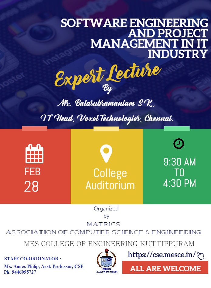 The association of Computer Science and Engineering (MATRICS) is organizing an expert lecture by Mr. Balasubramaniam S K , IT head, Voxel Technologies, Chennai. on the topic “SOFTWARE ENGINEERING AND PROJECT MANAGEMENT IN IT INDUSTRY “on 28th February 2020 in the College Auditorium.