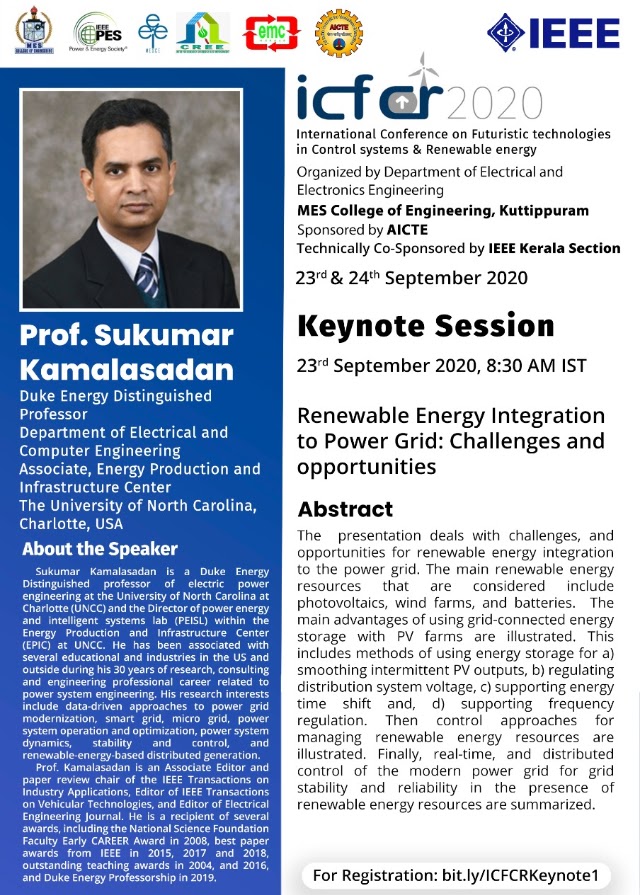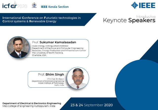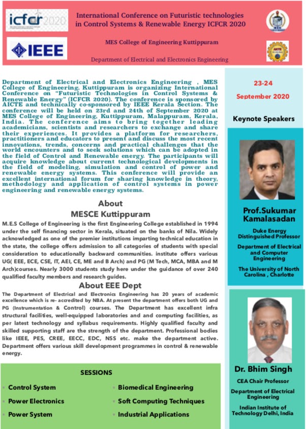 Department of Electrical and Electronics Engineering , MES College of Engineering, Kuttippuram is organizing International Conference on “Futuristic Technologies in Control Systems & Renewable Energy” (ICFCR 2020). The conference is sponsored by AICTE and technically co-sponsored by IEEE Kerala Section. The conference will be held online on 23rd and 24th of September 2020. The conference aims to bring together leading academicians, scientists and researchers to exchange and share their experiences. It provides a platform for researchers, practitioners and educators to present and discuss the most recent innovations, trends, concerns and practical challenges that the world encounters and to seek solutions which can be adopted in the field of Control and Renewable energy. The participants will acquire knowledge about current technological developments in the field of modeling, simulation and control of power and renewable energy systems and also this will improvise their performances. This conference will provide an excellent international forum for sharing knowledge in theory, methodology and application of control systems in power engineering and renewable energy systems.
