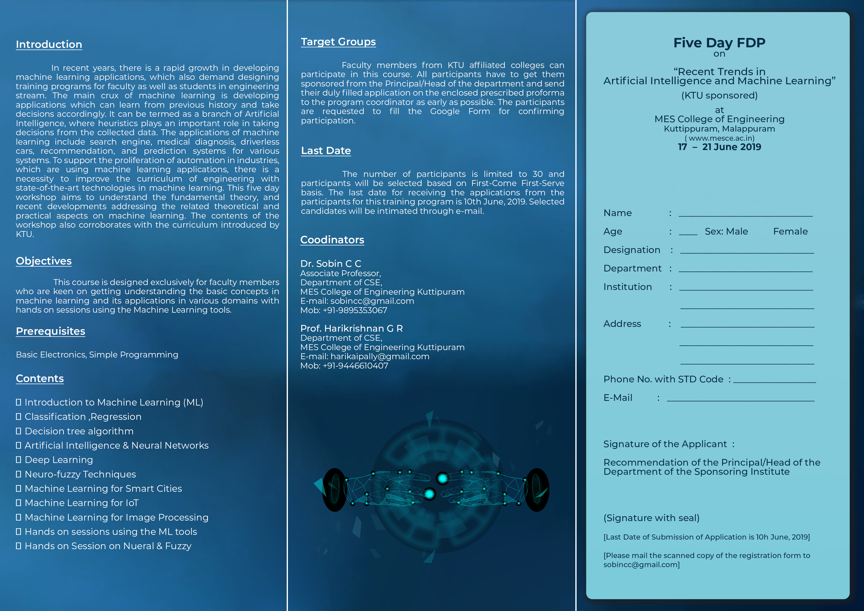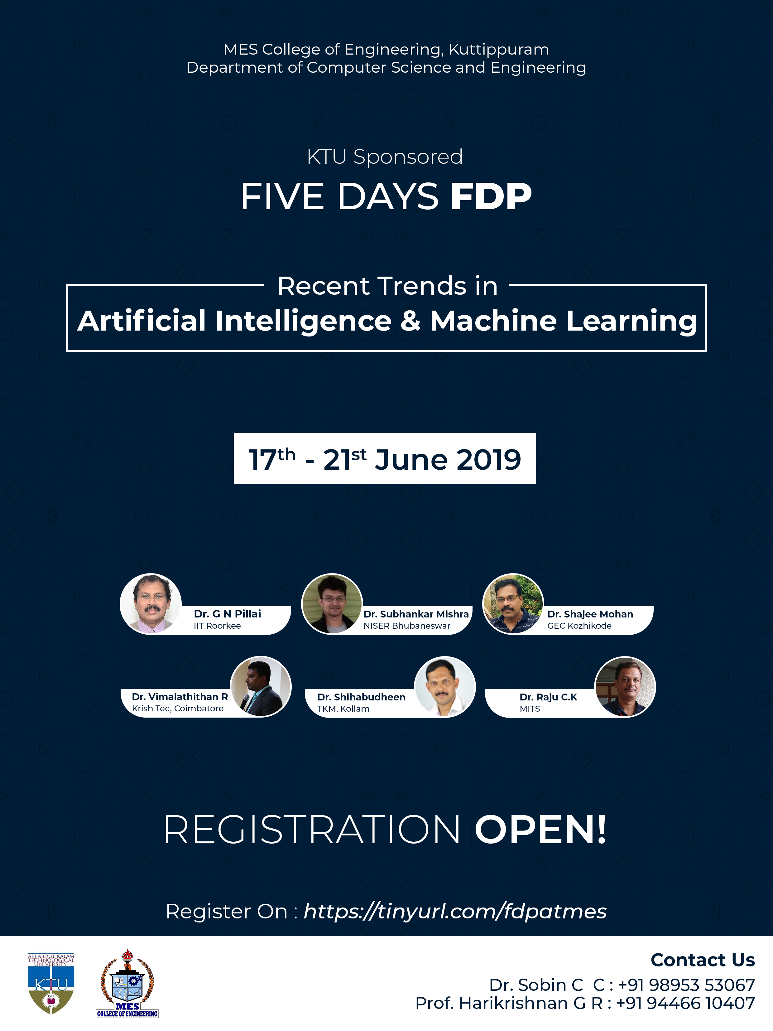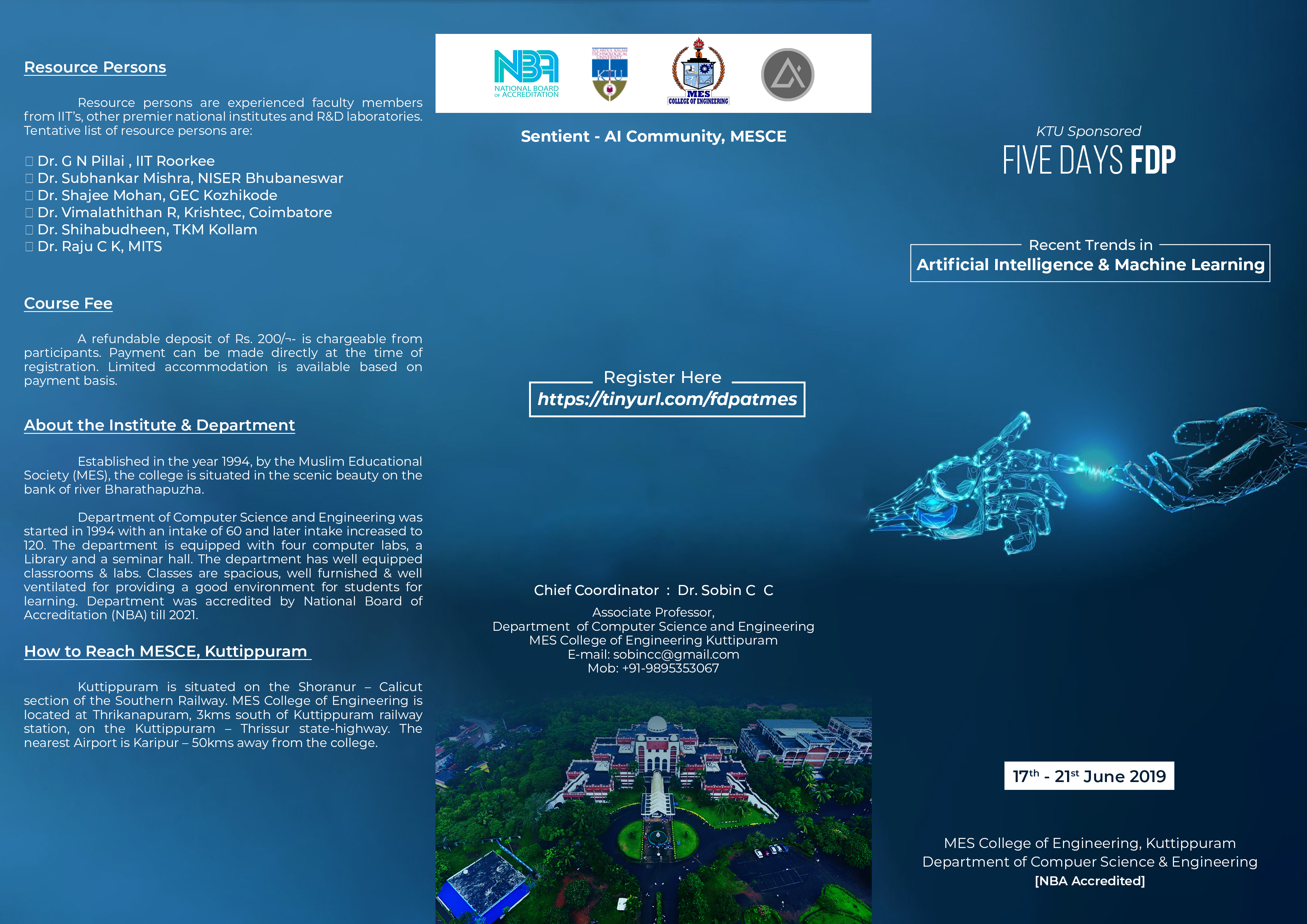 Department of Computer Science and Engineering is organizing one week KTU Sponsored faculty development Programme on Recent Trends in Artificial Intelligence and Machine Learning from 17th to 21st June 2019 at CSE Seminar Hall.
