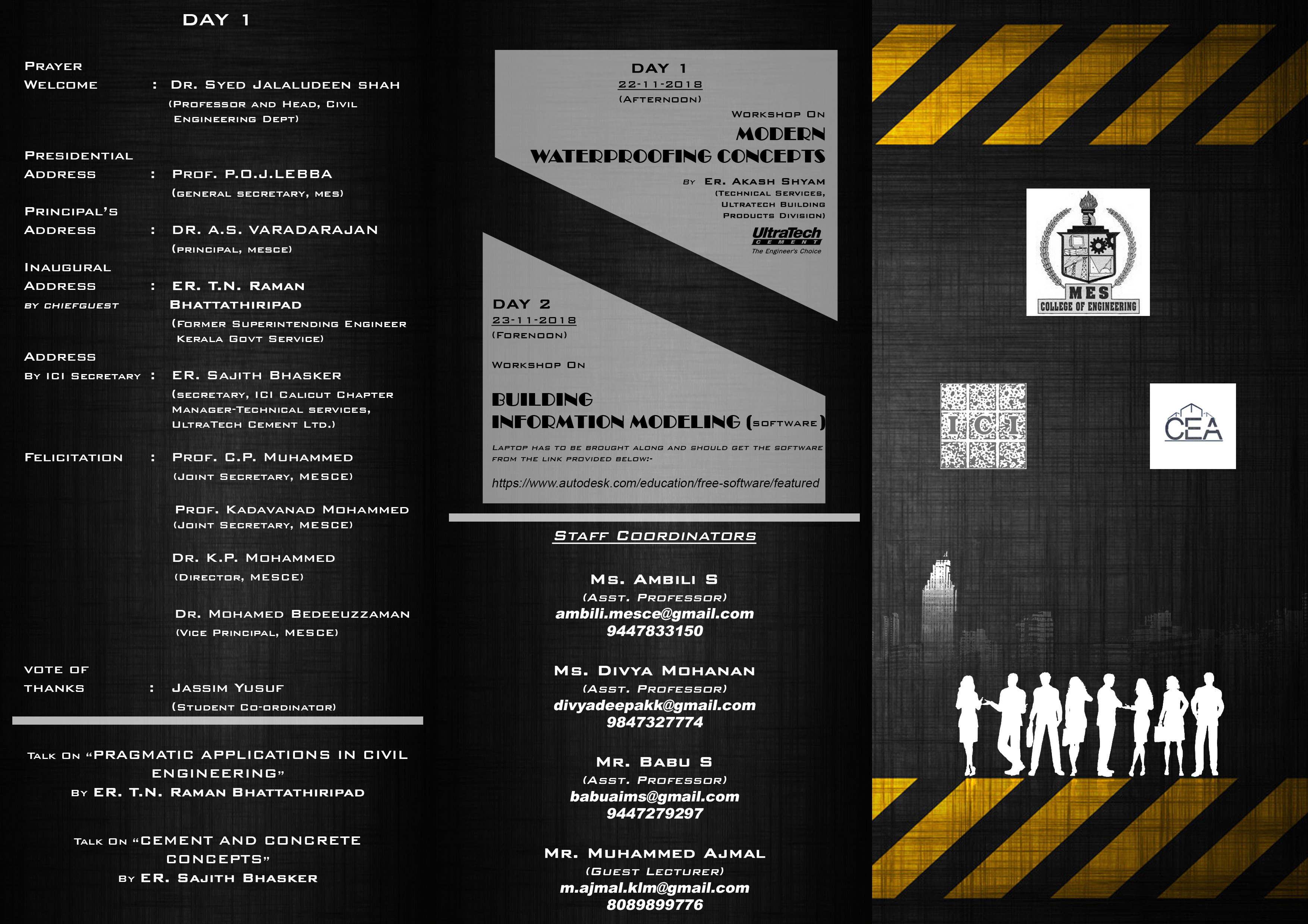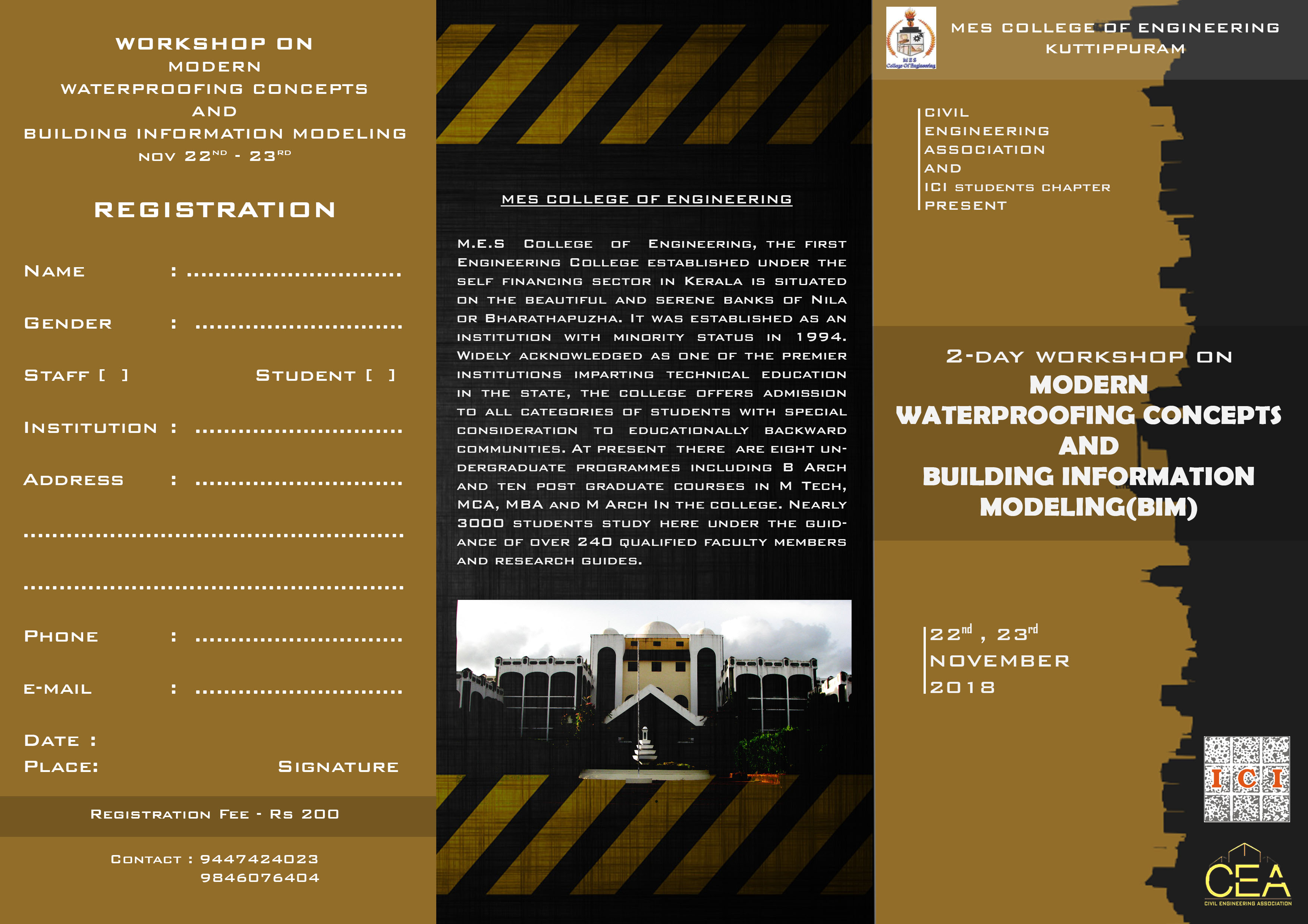 Civil Engineering Department of MES College of Engineering, Kuttippuram is organising a ‘Two day workshop on Modern Waterproofing concepts and Building Information Modeling’ on 22nd & 23rd November 2018. The programme is organized by Civil Engineering Association (CEA) and Indian Concrete Institute (ICI) students' chapter.