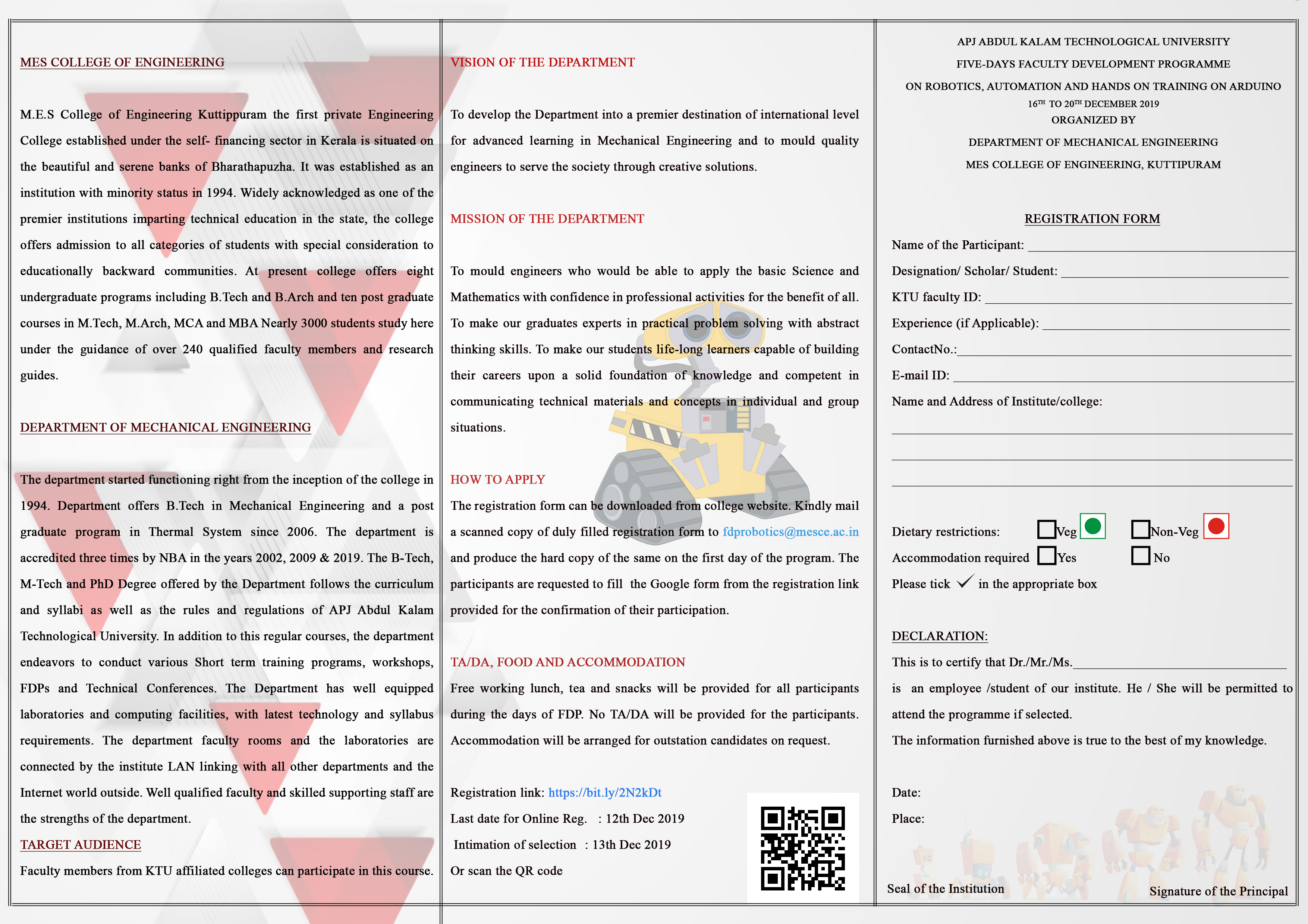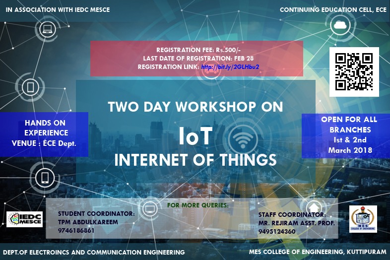 Department of ECE, MES College of Engineering Kuttippuram is organizing a Two day Hands-on Workshop on “IOT” for PG/UG students on 1st-2nd March 2018 from 10.00 AM to 04.00 PM. This workshop is designed exclusively for students, getting hands-on with Raspberry Pi based Embedded system on the concept of Internet of Things (IoT). With the wide availability of Broadband Internet, the cost of connecting more devices to Internet has drastically reduced. Internet of Things has thus emerged which allows literally any device connected to the Internet, with an estimated number of over 100 billion devices within the next 5 years from now. This course introduces you to the amazing world of IoT and its fascinating applications, using a Raspberry Pi computer. This workshop includes controlling of devices by sensors and relays which makes human life easier and comfortable. A course fee of Rs. 500/- is chargeable from students. The course fee includes course materials (if any) and participation fee. Please find the program brochure and the poster attached. The participants can register on line through following link https://bit.ly/2GLHbu2 . The number of participants of this workshop is limited to 30 and the registration is on first come first serve basis. We request your participation in this regard and also the participation of all interested students in your department/ institution.