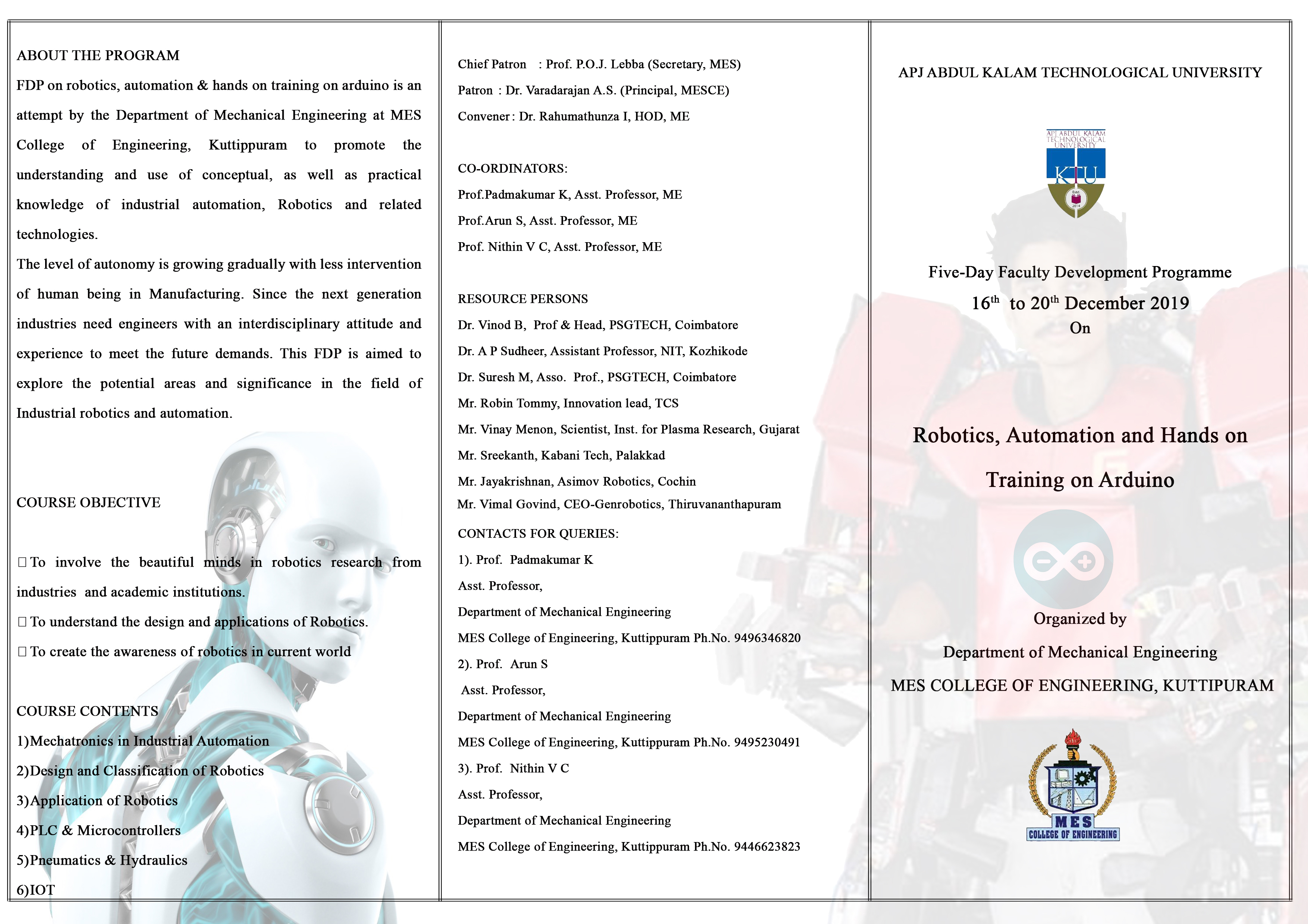 Department of CSE, MES College of Engineering Kuttippuram is organizing Two day Hands-on Workshop on Robotics using Arduino for PG/UG students on 19th -20th January 2018 from 10.00 AM to 04.30 PM. This workshop is designed exclusively for students as well as professionals who are keen on getting hands-on with Robotics technology based on the concept of Internet of Things (IoT). Internet of Things is a new revolution of the Internet. A world where the real, digital and the virtual are converging to create smart environments that make energy, transport, cities and many other areas more intelligent. This workshop includes controlling of devices by sensors and relays which makes human life easier and comfortable. The students will work on ESP8266 Wi-Fi module and Sensors along with Arduino microcontroller. At the end of the workshop, participants would be able to receive an unparalleled education on the art of building robots & applications using Arduino and gain profound knowledge of IoT applications and related state-of-the-art. A course fee of Rs. 800/- is chargeable from students. The course fee includes course materials (if any) and participation fee. Payment can be made through Tez (Number: 7907108377), ensure that the name of student and college and place are added as notes. Seats are confirmed only after payment.