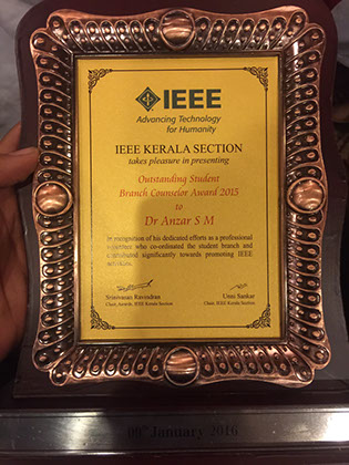 Dr. Anzar S. M., Associate Professor AEI and IEEE Student Branch Counselor have been awarded Outstanding Student Branch Counselor Award 2015 from IEEE Kerala Section, in recognition of his dedicated efforts in reviving the IEEE Student Branch of MES College of Engineering. Presently IEEE Student Branch MESCE has 162 student members and last year (2015) the MESCE SB has conducted many programs including spectrum talks, debates, panel discussions, intercollegiate technical workshops, and expert talks.
