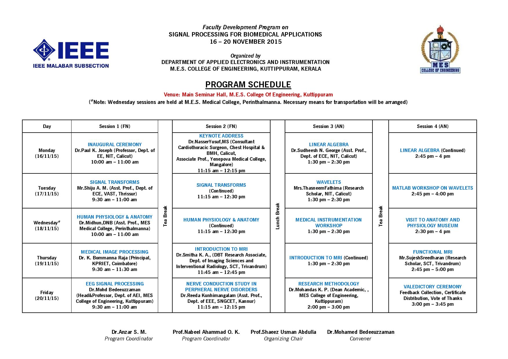 The Department of Applied Electronics and Instrumentation Engineering at M.E.S. College of Engineering, Kuttippuram, in association with IEEE Malabar Subsection, is organizing a 5-day Faculty Development Program on "Signal Processing for Biomedical Applications" from 16th to 20th of November 2015. The goal of this course is to impart a solid foundation in applying mathematical and signal processing tools on biomedical signals. There will be lectures delivered by experts in the area from leading Engineering and Medical Research Institutions. The Program Brochure, Application form and detailed course schedule can be downloaded from here. Last Date of receipt of the Application: 14/11/2015 All correspondence concerning registration should be addressed to aei@mesce.ac.in. For additional information, please contact the coordinators, Dr. Anzar S. M. (9447244119) and Prof. Nabeel Ahammed O. K. (9745052564).